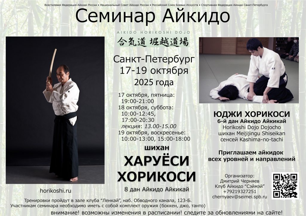 17-19 октября 2025 года в Санкт-Петербурге пройдет долгожданный семинар Сенсея Хорикоси. Также вместе с ним нас посетит и его сын, Юджи Хорикоси ( 6 дан Айкидо Айкикай )